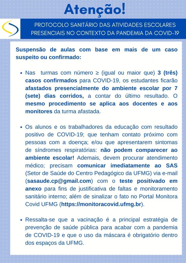 ATENÇÃO: Protocolo sanitário das atividades escolares presenciais no contexto da pandemia da COVID-19